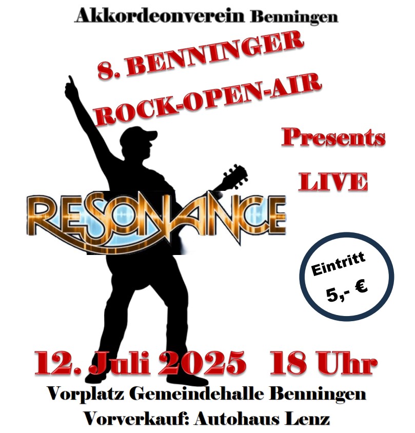 Am 12.07.2025 findet unser Open Air wieder am Platz der Gemeindehalle in Benningen statt. Bei hoffentlich sehr schönem Wetter, ohne Gewitter, möchten wir wieder ein paar schöne Stunden mit Ihnen erleben. Es wird die Band „Resonance“ rockige Klänge spielen und bei leckeren Getränken, einem Bierwagen und Essen „auf die Hand“ ist auch für Ihr leibliches Wohl gesorgt. Der Eintrittspreis beträgt 5€. Der Vorverkauf findet in bewährter Weise im Autohaus Lenz in Benningen ab dem 30.06.2025 statt. Zusätzlich wird es eine Abendkasse geben. Beginn der Veranstaltung ist um 18.00 Uhr.